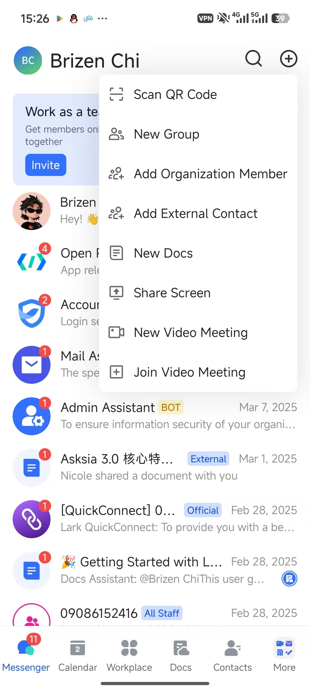 QR code won't scan: Make sure you're using the Feishu (Lark) app's built-in scanner — not your phone's default camera app. From Messenger, tap '+' then 'Scan QR Code'.