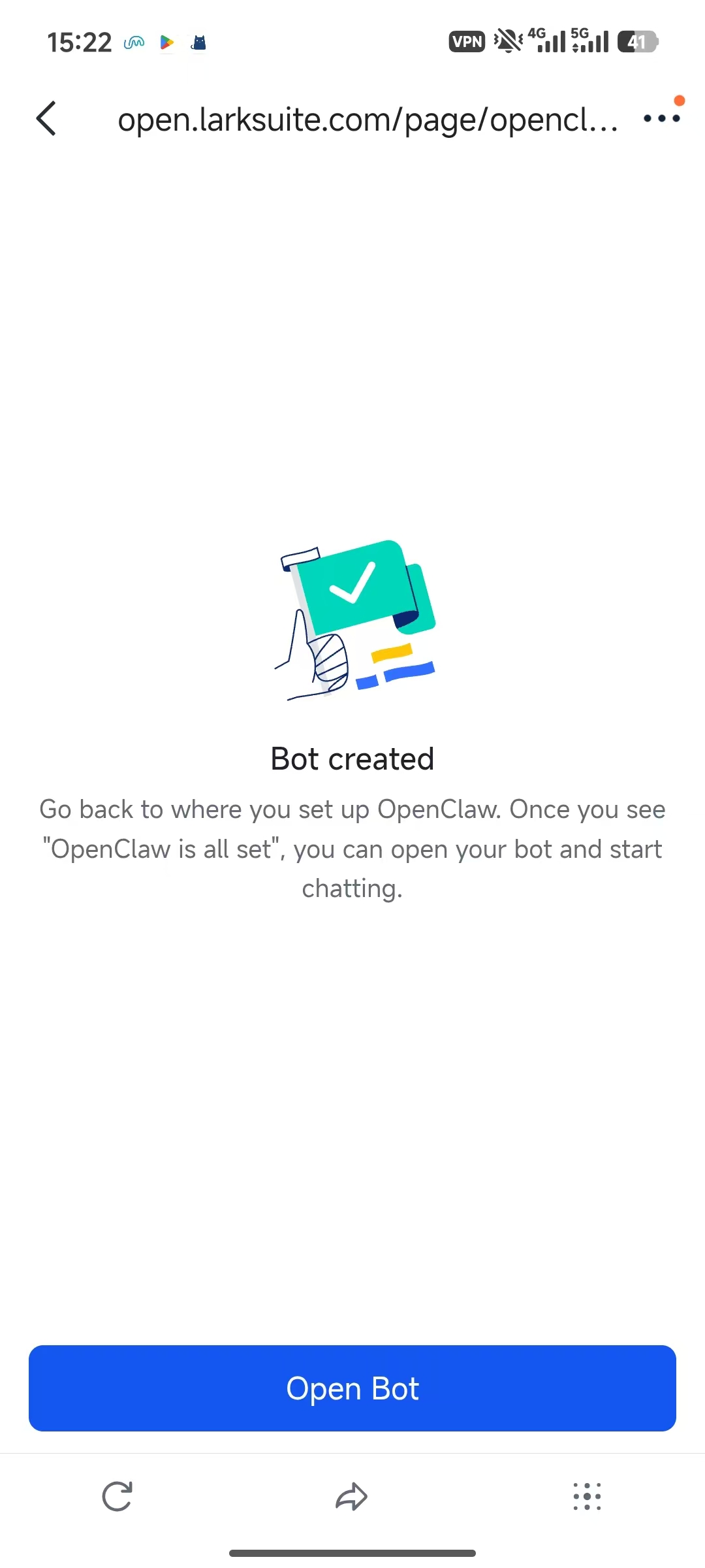 - An 'Open Bot' button to jump directly into a Feishu chat with your new bot