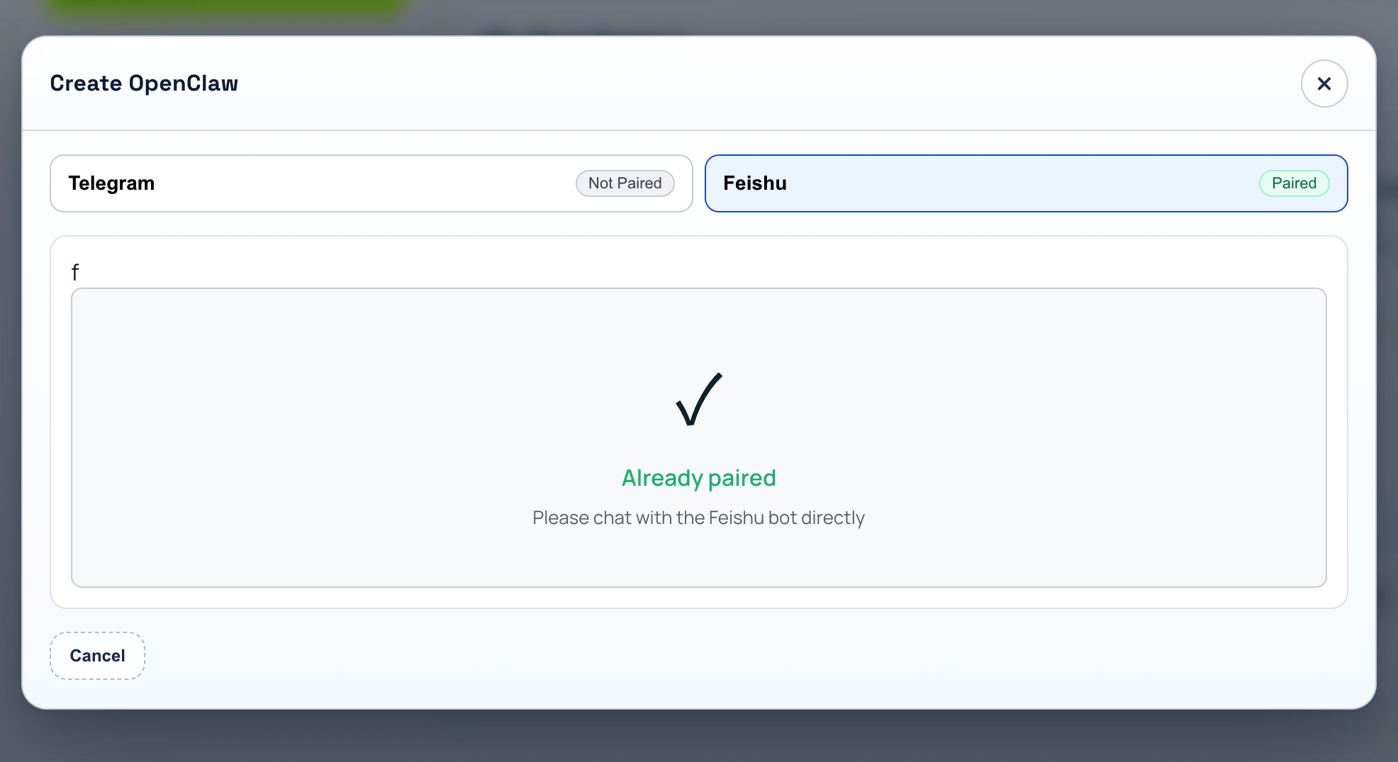 - A checkmark icon with 'Already paired' and message: 'Please chat with the Feishu bot directly.'