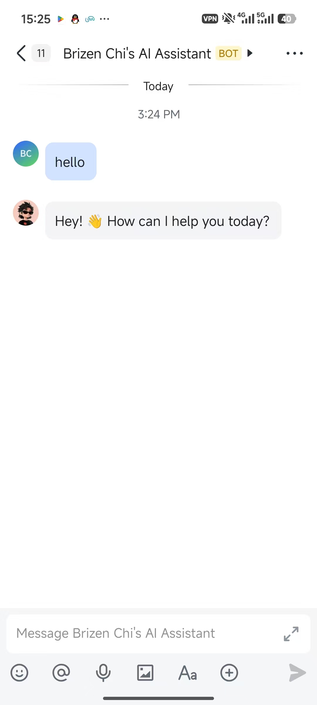 Open the Feishu (Lark) app and find your newly created bot in the chat list. It appears with the avatar and name you chose, along with a blue 'BOT' badge.