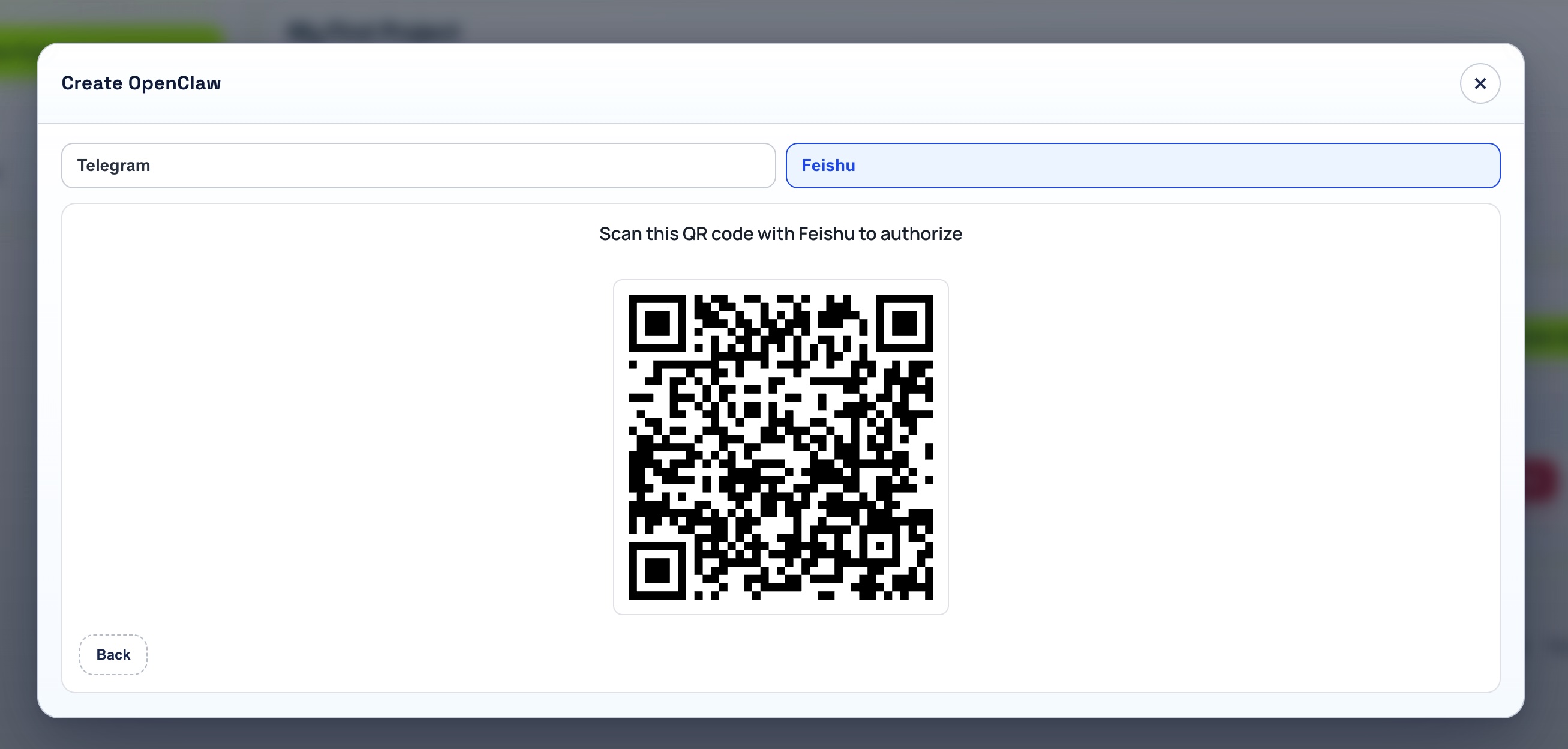 At the top of the dialog, click the Feishu tab. ClawMesh displays a QR code with the instruction 'Scan this QR code with Feishu to authorize.' This QR code contains an authorization link to the Lark Open Platform that will create a bot in your Feishu organization and connect it to your ClawMesh OpenClaw instance.