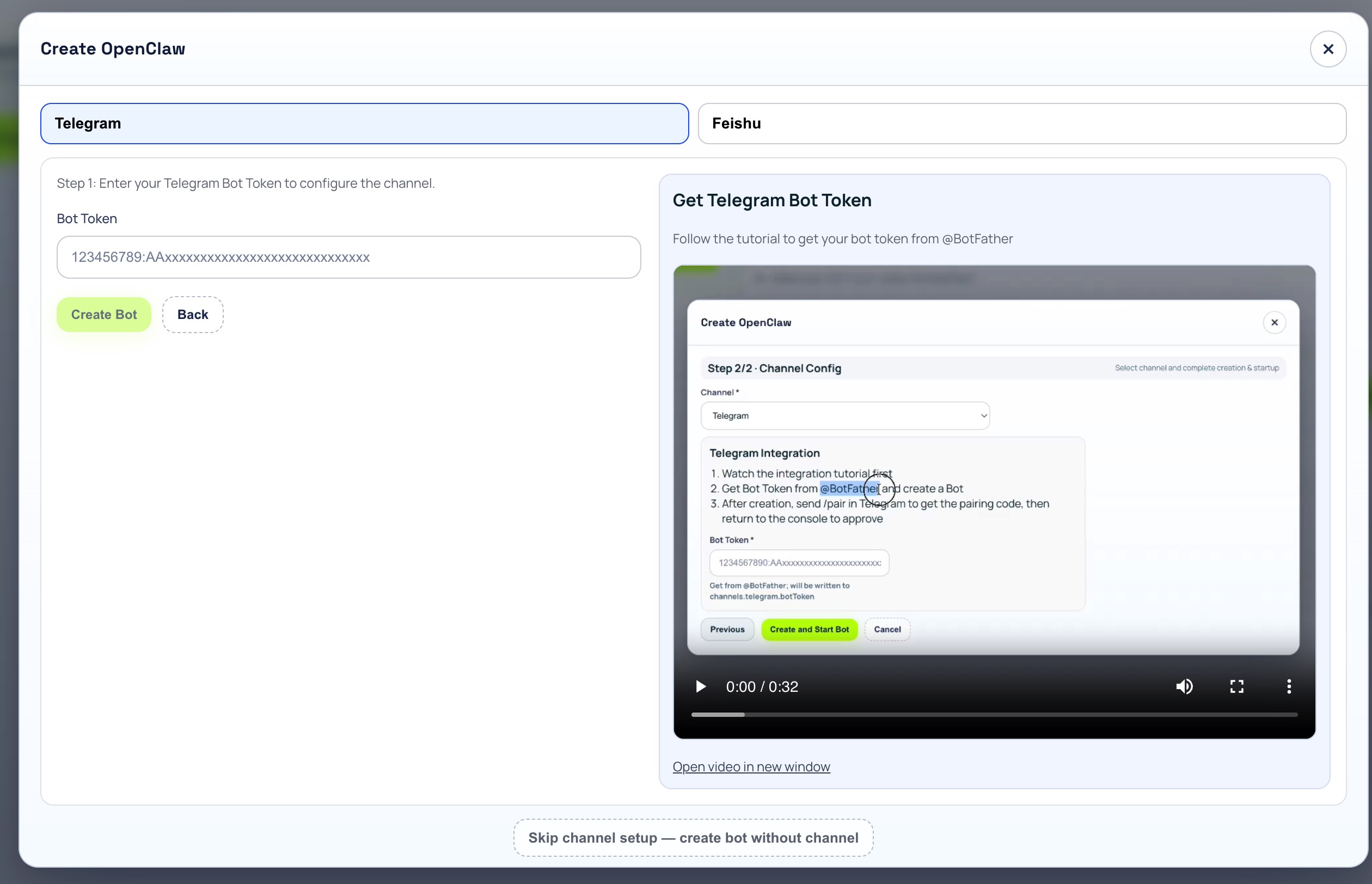 Alternatively, click 'Skip channel setup — create bot without channel' if you want to connect Telegram later through the Edit panel.