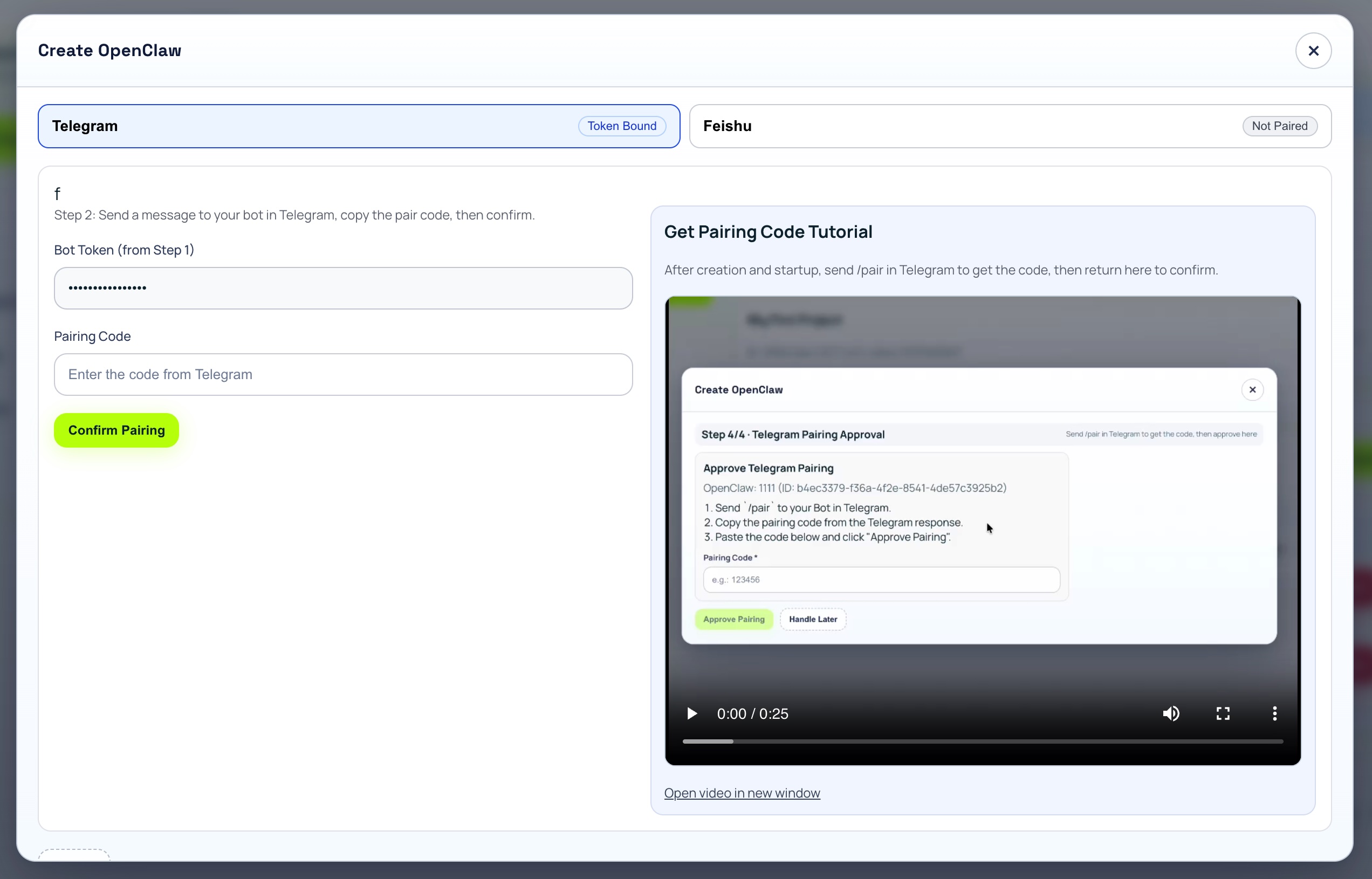 With your pairing code copied from Telegram, switch back to the ClawMesh console.